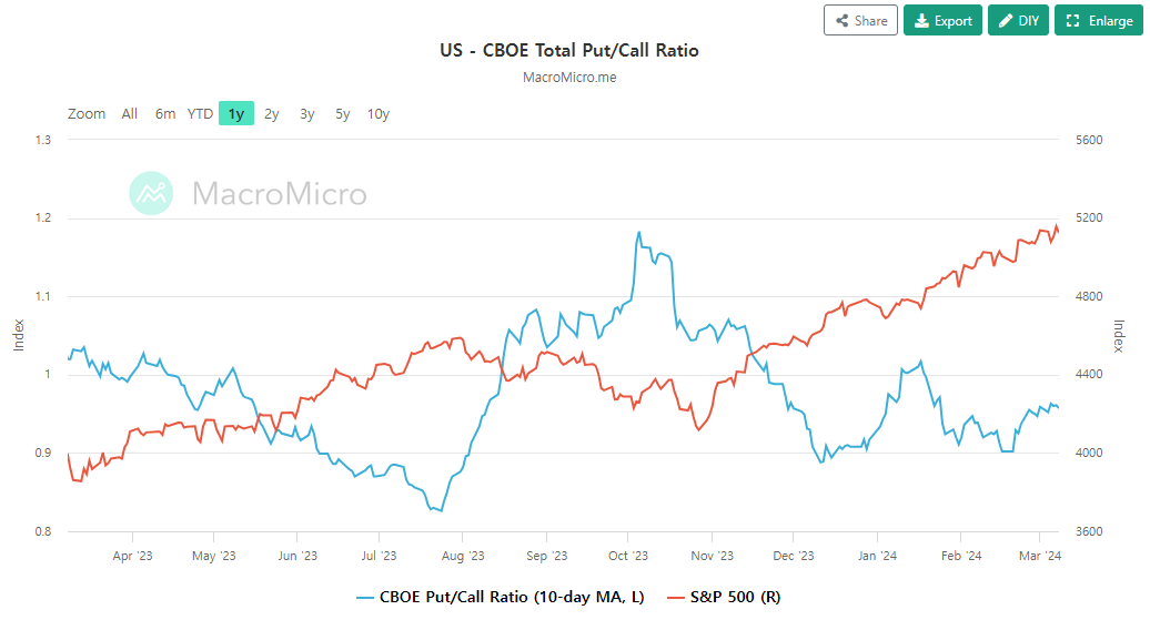 위 표는 최근 1년간 S&P 500과 그에 대한 옵션 P/C 비율이다.