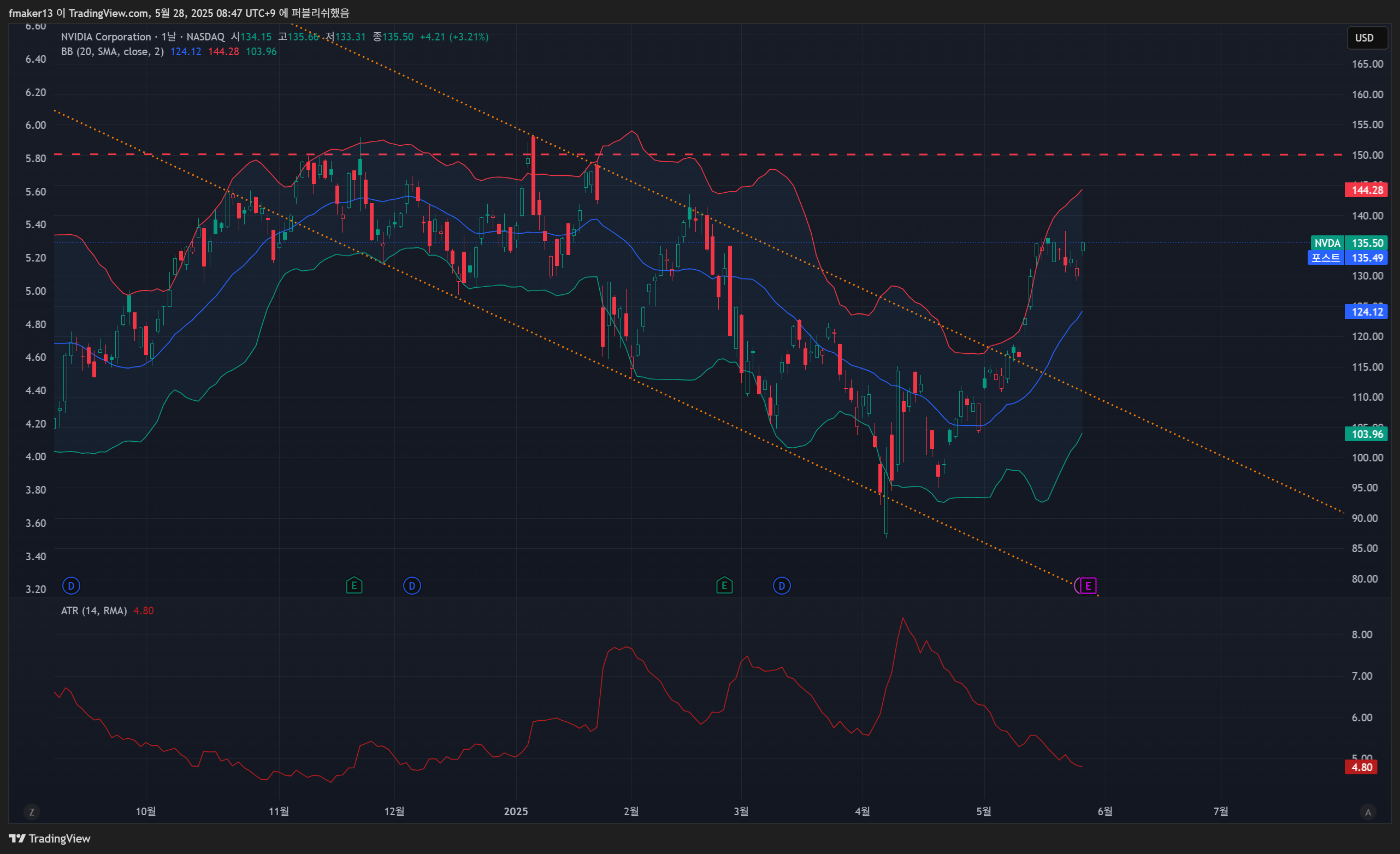 - 참고로, 2025년 5월 27일 기준 최근 20일 고점은 약 137.40 (5월 21일)으로 보입니다.
